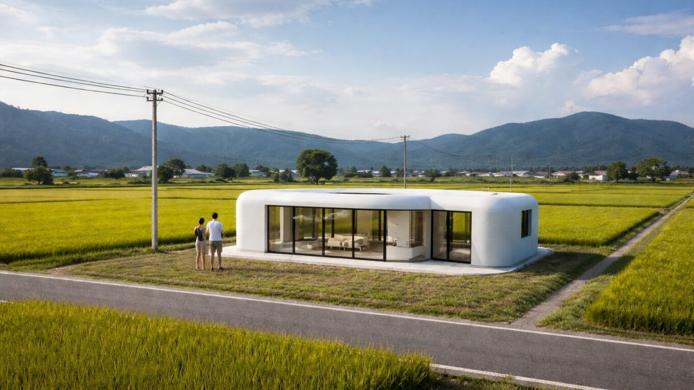 土地が安い場所を探すと、どうしても農村地帯や田園風景が広がるエリアに行き当たります。しかし、そこにポツンと未来的なデザインの3D住宅を建てるのは、想像以上に勇気が必要です。